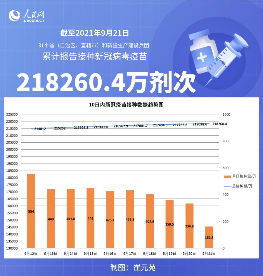 人民網(wǎng)北京9月22日電 (記者崔元苑)據(jù)國(guó)家衛(wèi)生健康委官網(wǎng)消息,截至2021年9月21日,31個(gè)。ㄗ灾螀^(qū)、直轄市)和新疆生產(chǎn)建設(shè)兵團(tuán)累計(jì)報(bào)告接種新冠病毒疫苗218260.4萬(wàn)劑次。