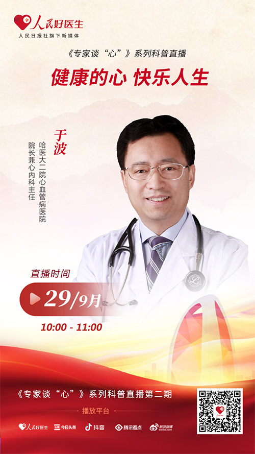 心血管疾病是一種常見的慢性非傳染性疾病。心血管疾病的患病人群逐漸趨于年輕化。哪些行為或因素會(huì)導(dǎo)致疾病的發(fā)生?老年人和年輕人在疾病的預(yù)防方面存在什么區(qū)別?9月29日10:00-11:00,哈爾濱醫(yī)科大學(xué)附屬第二醫(yī)院心血管病醫(yī)院院長兼心內(nèi)科主任于波將做客“人民好醫(yī)生”APP直播間,為大眾科普心血管疾病的預(yù)防知識(shí)。歡迎屆時(shí)收看。