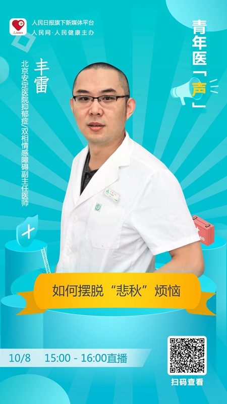 10月8日15:00-16:00,北京安定醫(yī)院抑郁癥/雙相情感障礙副主任醫(yī)師豐雷將做客人民日報社旗下新媒體“人民好醫(yī)生”客戶端,與大家聊聊秋季抑郁的話題,做好自我防范,幫助自己也幫助他人遠離抑郁危害。歡迎到時收看!
