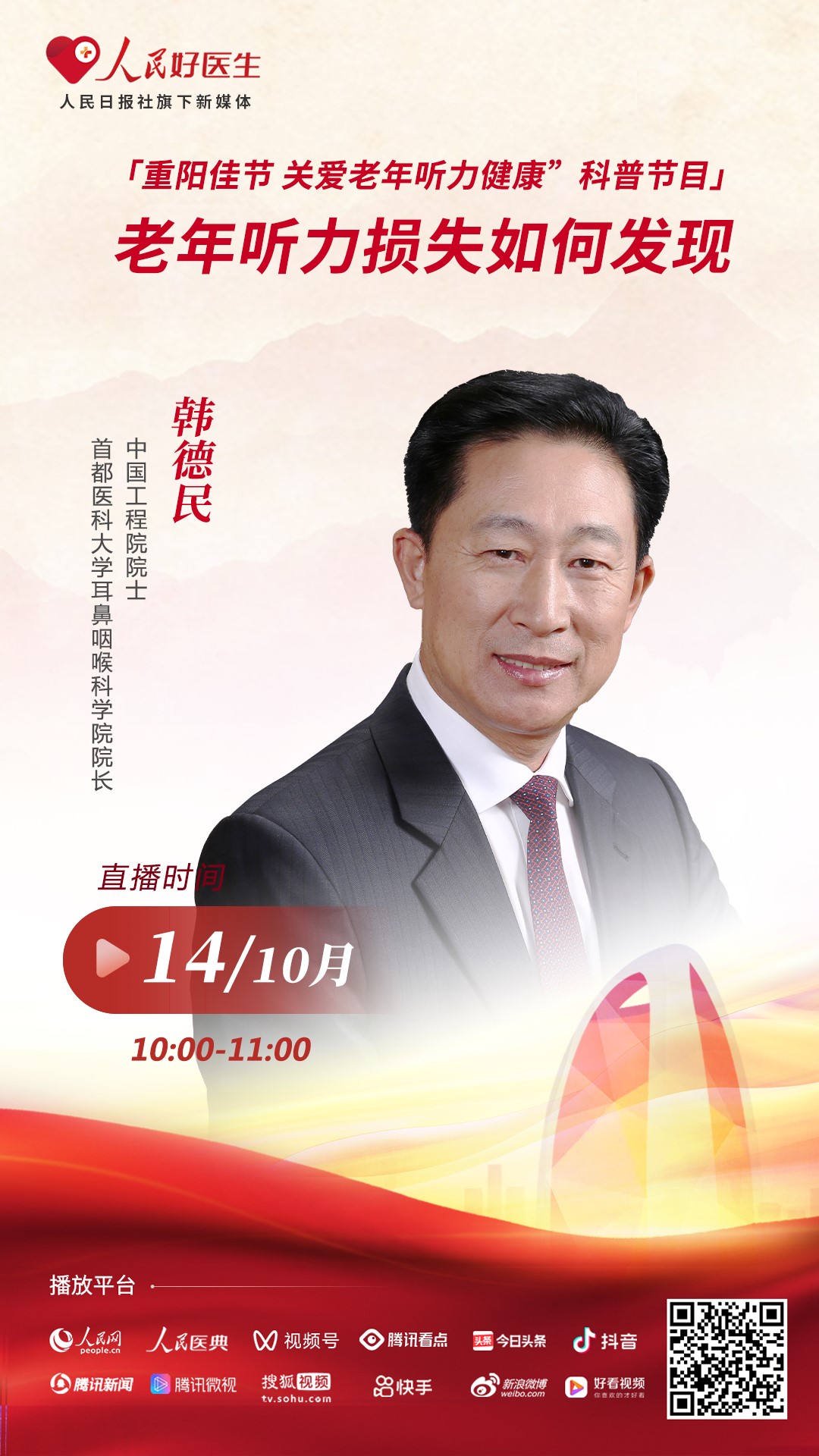 為提升大眾對耳與聽力健康知識的認知度,普及耳聾預防的康復知識,降低老年人發(fā)生聽力損失的風險,人民網(wǎng)·人民健康與全國防聾治聾技術指導組共同開展“重陽佳節(jié) 關愛老年聽力健康”系列科普節(jié)目。10月14日10:00,“人民好醫(yī)生”客戶端將邀請中國工程院院士韓德民進行視頻直播,為您科普老年聽力損失的相關知識,千萬不要錯過。