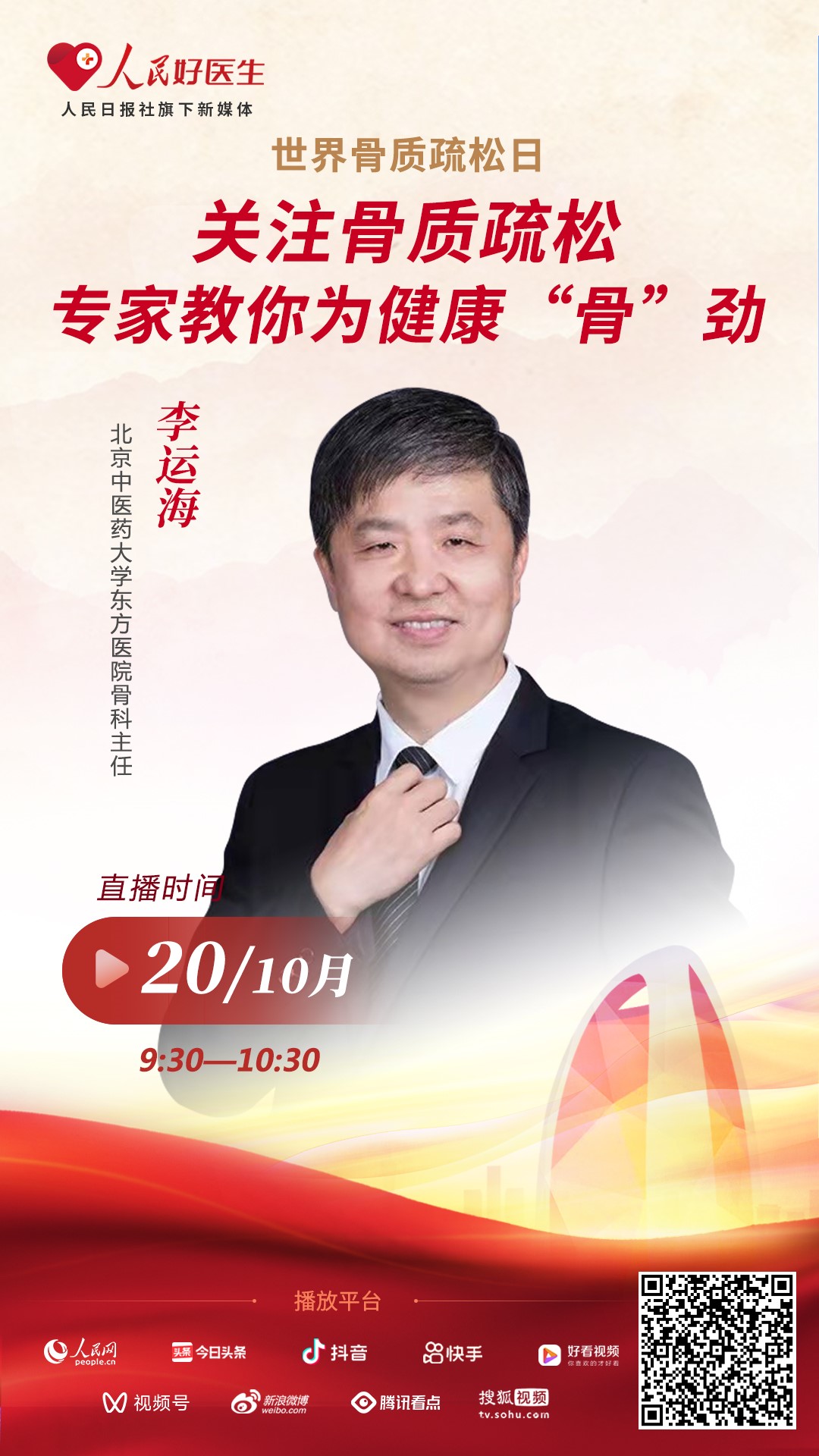10月20日9:30,北京中醫(yī)藥大學(xué)東方醫(yī)院骨科主任李運(yùn)海將做客人民好醫(yī)生客戶端,和大家分享有關(guān)骨質(zhì)疏松防治相關(guān)知識(shí)。