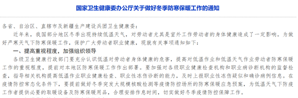人民網(wǎng)北京10月19日電 (記者張文婷)近年來,我國部分地區(qū)冬季出現(xiàn)持續(xù)低溫天氣,對勞動者尤其是室外工作勞動者的身體健康造成了一定影響。為做好嚴(yán)寒天氣下防寒保暖工作,保護廣大勞動者職業(yè)健康,近日,國家衛(wèi)生健康委辦公廳印發(fā)了《國家衛(wèi)生健康委辦公廳關(guān)于做好冬季防寒保暖工作的通知》(以下簡稱《通知》),從加強組織領(lǐng)導(dǎo)、監(jiān)督檢查和宣傳教育三個方面提出了具體要求。