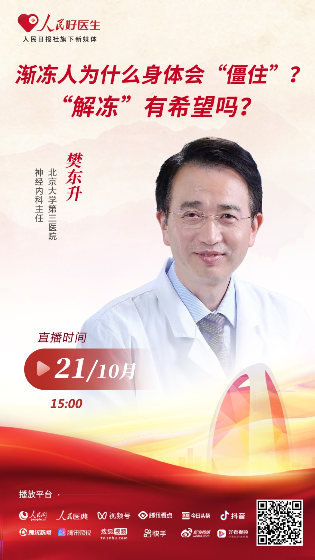 漸凍癥的病因是什么?為什么身體會(huì)“僵住”?哪些人群最高危?10月21日15:00,北京大學(xué)第三醫(yī)院神經(jīng)內(nèi)科主任樊東升將做客人民日?qǐng)?bào)社旗下新媒體“人民好醫(yī)生”客戶端,與我們聊聊漸凍癥的話題,讓我們一起來關(guān)注罕見病,關(guān)注“漸凍人”群體,幫助他們提高生活質(zhì)量。