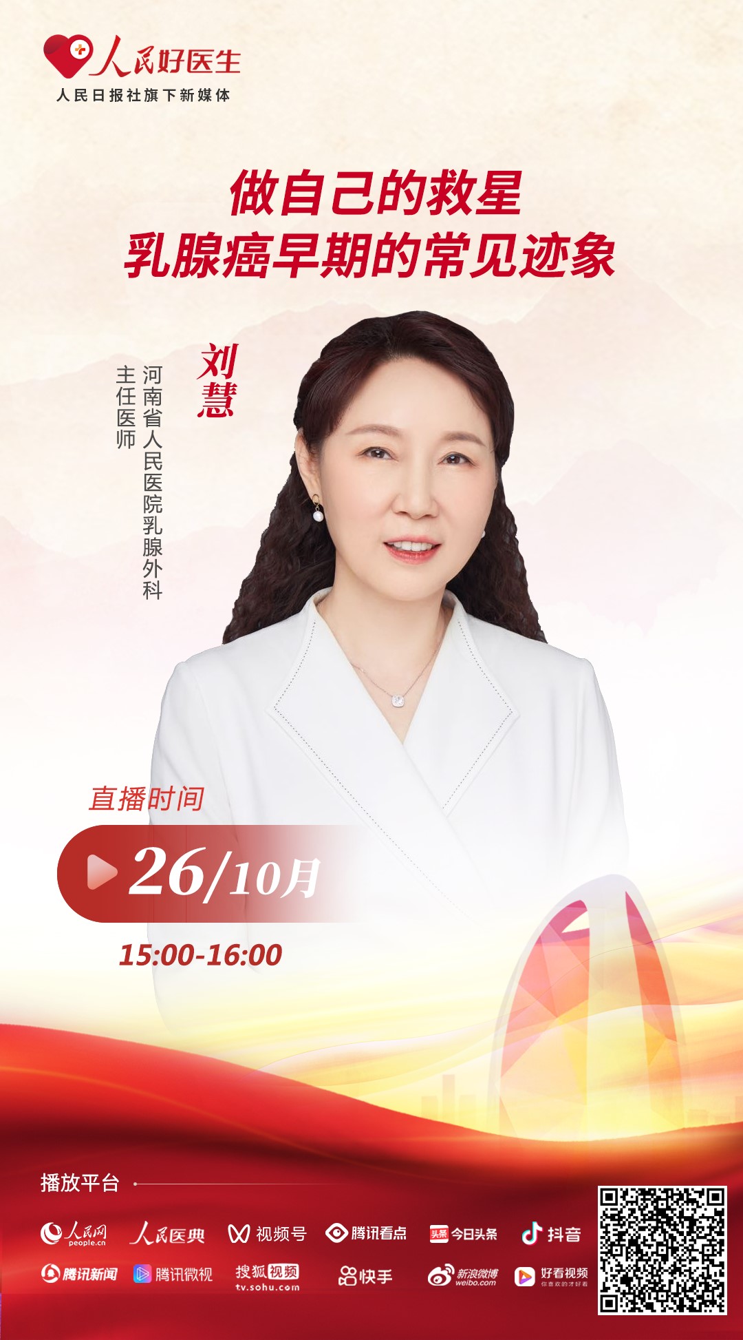 乳腺癌的預(yù)后與疾病的發(fā)展階段密切相關(guān),疾病越早被發(fā)現(xiàn),則患者5年內(nèi)存活的機(jī)會就越大,因此早診早治尤為關(guān)鍵。10月26日(周二)15:00,“人民好醫(yī)生”客戶端將邀請河南省人民醫(yī)院乳腺外科主任醫(yī)師劉慧進(jìn)行視頻直播,為您科普乳腺癌早診早治的相關(guān)知識,千萬不要錯過。