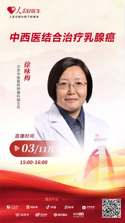 人民日報社旗下新媒體平臺“人民好醫(yī)生”APP直播間邀請到北京中醫(yī)醫(yī)院腫瘤科副主任徐詠梅為廣大網(wǎng)友們分享中西醫(yī)結(jié)合治療乳腺癌的相關(guān)科普知識,歡迎屆時收看。
