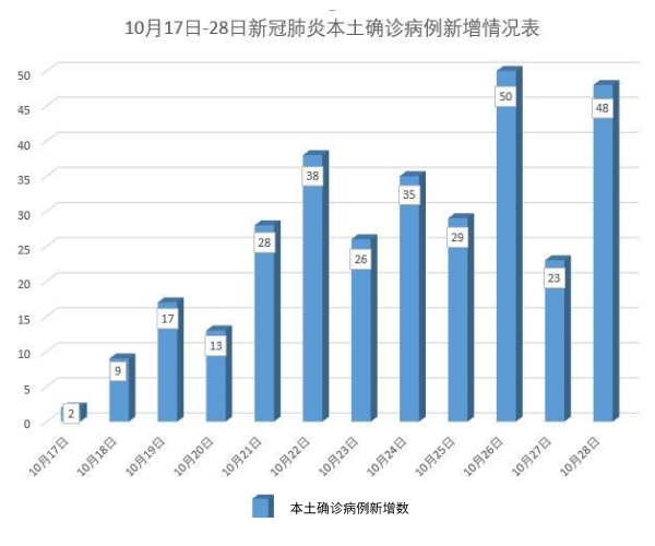 當(dāng)前,國外疫情持續(xù)蔓延,季節(jié)因素疊加,容易引發(fā)疫情傳播擴散。10月17日以來,國內(nèi)出現(xiàn)多點散發(fā)本土疫情,呈快速發(fā)展態(tài)勢,根據(jù)國家衛(wèi)健委數(shù)據(jù)統(tǒng)計,截至10月28日,兩周新增確診本土病例318例,波及北京、內(nèi)蒙古、河北、湖南、湖北、寧夏、陜西等多個省(區(qū)市)。