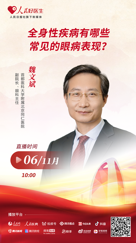 11月6日10:00至11:00,人民日報社旗下新媒體客戶端“人民好醫(yī)生”將邀請首都醫(yī)科大學(xué)附屬北京同仁醫(yī)院副院長、眼科主任魏文斌做客直播間,和大家一起關(guān)注全身性疾病與眼病的關(guān)系,歡迎大家收看。