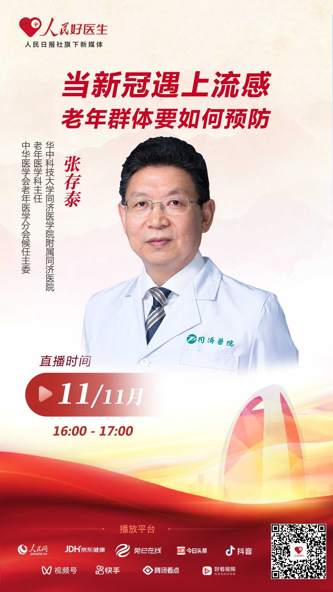 11月11日16:00,華中科技大學同濟醫(yī)學院附屬同濟醫(yī)院老年醫(yī)學科主任張存泰做客人民好醫(yī)生客戶端,為網友科普老年群體應如何預防流感等相關話題,歡迎屆時收看。