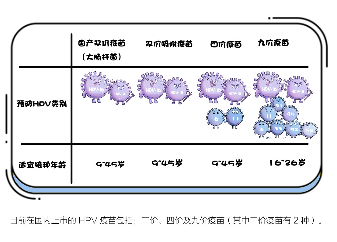 專家介紹,接種HPV疫苗可以預(yù)防約70%—90%的宮頸癌。目前,在國內(nèi)上市的HPV疫苗包括二價、四價及九價疫苗。二價疫苗針對HPV-16和18兩種高危型別;四價疫苗在這兩者基礎(chǔ)上,增加了HPV-6和11兩個低危型別;九價疫苗則在四價疫苗基礎(chǔ)上多加了5種高危型別HPV,分別是HPV-31、33、45、52、58。四價和九價疫苗適用于9-45歲女性,但九價疫苗僅適用于16-26歲女性。