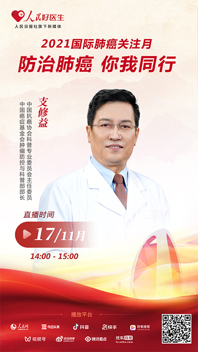 11月17日14:00-15:00,人民日?qǐng)?bào)社旗下新媒體平臺(tái)“人民好醫(yī)生”將邀請(qǐng)到中國(guó)抗癌協(xié)會(huì)科普專(zhuān)業(yè)委員會(huì)主任委員、中國(guó)癌癥基金會(huì)腫瘤防控與科普部部長(zhǎng)支修益,為公眾科普肺癌防治的相關(guān)知識(shí)。千萬(wàn)不要錯(cuò)過(guò)。
