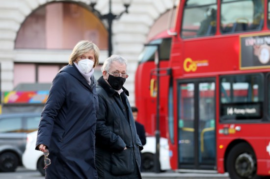 11月25日,人們?cè)谟?guó)倫敦佩戴口罩出行。新華社記者 李穎 攝
