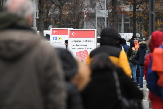 11月25日,在德國(guó)法蘭克福,人們?cè)谝惶幮鹿谝呙缰行耐馀抨?duì)等待接種疫苗。 新華社記者 逯陽(yáng) 攝