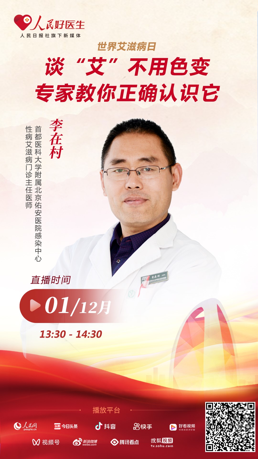 12月1日13:30,首都醫(yī)科大學附屬北京佑安醫(yī)院感染中心性病艾滋病門診主任醫(yī)師李在村將做客人民日報社旗下新媒體平臺“人民好醫(yī)生”客戶端直播間,向廣大網(wǎng)友分享艾滋病相關(guān)知識,歡迎屆時收看。