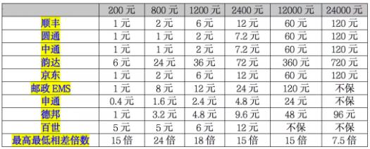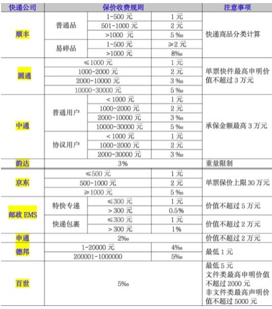 調(diào)研結果顯示,大部分快遞公司的保價費按照消費者寄遞的物品聲明價值劃分收費區(qū)間,相對低一些的聲明價值實行定額保價費,而聲明價值較高的實行比例保價費率。韻達、申通、百世3家快遞都是實行比例保價費率。