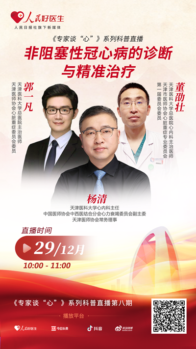 12月29日10:00-11:00,人民日報社旗下新媒體客戶端“人民好醫(yī)生”將邀請?zhí)旖蜥t(yī)科大學心內科主任、中國醫(yī)師協(xié)會中西醫(yī)結合分會心力衰竭委員會副主委楊清,天津醫(yī)科大學總醫(yī)院心內科主治醫(yī)師、天津市醫(yī)師協(xié)會心臟重癥專業(yè)委員會第一屆委員會委員董劭壯,天津醫(yī)科大學總醫(yī)院主治醫(yī)師、天津醫(yī)師協(xié)會心臟重癥委員會委員郭一凡做客直播間,為大家?guī)矸亲枞怨谛牟〉脑\斷與精準治療的相關內容,歡迎大家收看。
