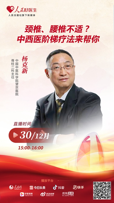 12月30日(周四)15:00-16:00,“人民好醫(yī)生”客戶端將邀請中國中醫(yī)科學(xué)院望京醫(yī)院脊柱二科主任楊克新進(jìn)行視頻直播,為您科普頸椎、腰椎疾病診療的相關(guān)知識(shí),千萬不要錯(cuò)過。