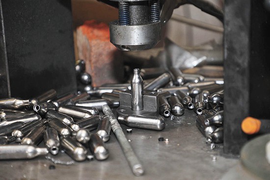 此圖為將“笑氣”灌裝在小鋼瓶內(nèi)的灌裝機(jī)器。 李超/攝