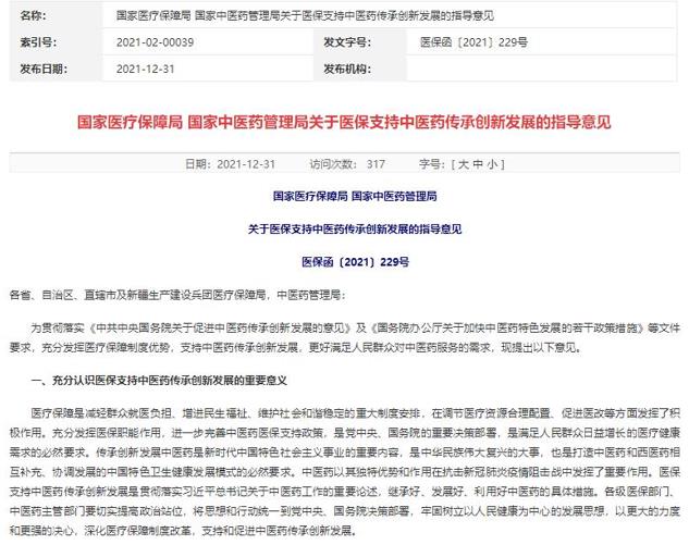 人民網(wǎng)北京12月31日電 (記者喬業(yè)瓊)為貫徹落實《中共中央國務(wù)院關(guān)于促進(jìn)中醫(yī)藥傳承創(chuàng)新發(fā)展的意見》及《國務(wù)院辦公廳關(guān)于加快中醫(yī)藥特色發(fā)展的若干政策措施》等文件要求,充分發(fā)揮醫(yī)療保障制度優(yōu)勢,支持中醫(yī)藥傳承創(chuàng)新發(fā)展,更好滿足人民群眾對中醫(yī)藥服務(wù)的需求,國家醫(yī)療保障局聯(lián)合國家中醫(yī)藥管理局發(fā)布《關(guān)于醫(yī)保支持中醫(yī)藥傳承創(chuàng)新發(fā)展的指導(dǎo)意見》(以下簡稱《指導(dǎo)意見》)。