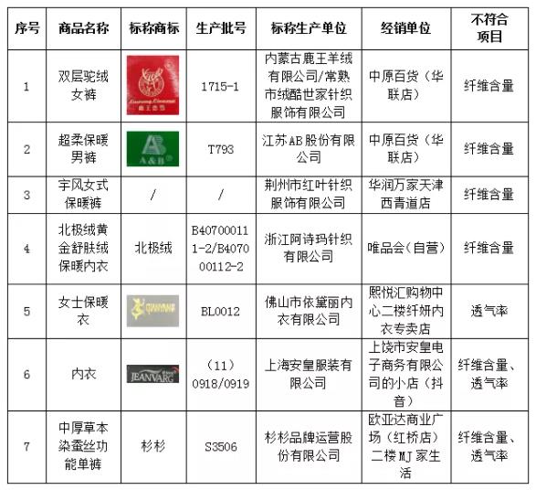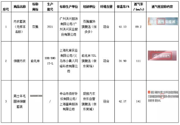購自“拼多多”的標(biāo)稱商標(biāo)為“芬騰”內(nèi)衣套裝(無樣本名稱)樣品、購自“京東商城”的標(biāo)稱商標(biāo)為“俞兆林”保暖內(nèi)衣和“袋鼠”男士羊毛圓領(lǐng)保暖套裝樣品透氣率實測分別為89.2mm/s、111mm/s、141mm/s,低于《針織保暖內(nèi)衣》標(biāo)準(zhǔn)規(guī)定透氣率應(yīng)≥180mm/s的規(guī)定。