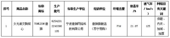 購自“蘇寧易購”的標(biāo)稱商標(biāo)為“TONLION唐獅”女無痕文胸背心樣品保溫率實測為21.87%,透氣率實測為125mm/s,低于“針織保暖內(nèi)衣”標(biāo)準(zhǔn)中保溫率應(yīng)≥30%、透氣率應(yīng)≥180mm/s的規(guī)定。