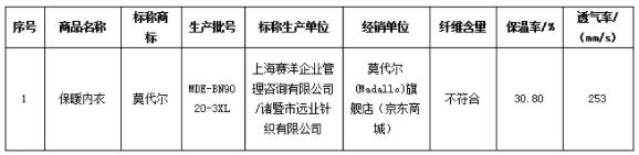 購自“京東商城”的標(biāo)稱商標(biāo)為“莫代爾”保暖內(nèi)衣樣品纖維含量不符合明示執(zhí)行標(biāo)準(zhǔn)。