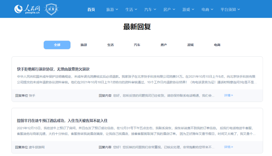 作為人民網(wǎng)重點(diǎn)打造的消費(fèi)者線上投訴維權(quán)服務(wù)平臺(tái),“人民投訴”致力于搭建消費(fèi)者與商家、企業(yè)及監(jiān)管部門之間溝通的橋梁,涵蓋旅游、汽車、房產(chǎn)、家電、3C、生活、游戲、電商等重點(diǎn)消費(fèi)領(lǐng)域,獨(dú)家設(shè)置“企業(yè)回復(fù)”“律師建議”“監(jiān)管回應(yīng)”“新聞線索”等多種處理方式,將用戶有效投訴線上轉(zhuǎn)交給企業(yè)、相關(guān)部門、專業(yè)人士對(duì)接,力求讓用戶投訴得到最快答復(fù)或解決。同時(shí),對(duì)集中、突出的熱點(diǎn)線索及時(shí)跟進(jìn)開展深度調(diào)查報(bào)道。