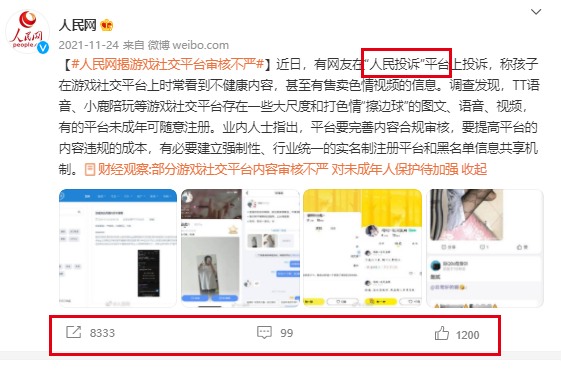 2021年推出游戲社交平臺(tái)監(jiān)督報(bào)道反響。(人民網(wǎng)微博截圖)