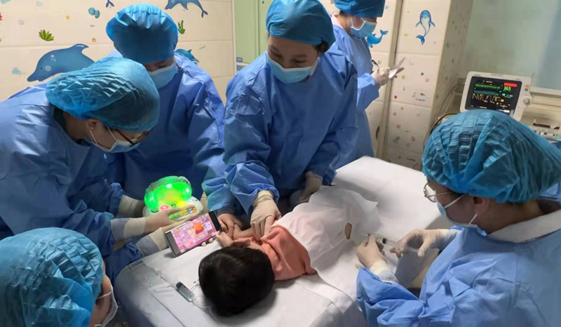 患兒在接受諾西那生鈉注射治療。河南省兒童醫(yī)院供圖
