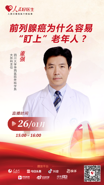 1月26日15:00-16:00,四川大學(xué)華西醫(yī)院外科學(xué)系/大外科主任董強(qiáng)將做客人民日報社旗下新媒體“人民好醫(yī)生”客戶端,就前列腺癌相關(guān)話題進(jìn)行分享,歡迎屆時收看。
