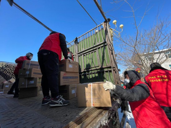 2月15日,在綏中縣的一處物資儲(chǔ)備點(diǎn),志愿者們?cè)诎徇\(yùn)防疫物資。新華社記者李昂 攝