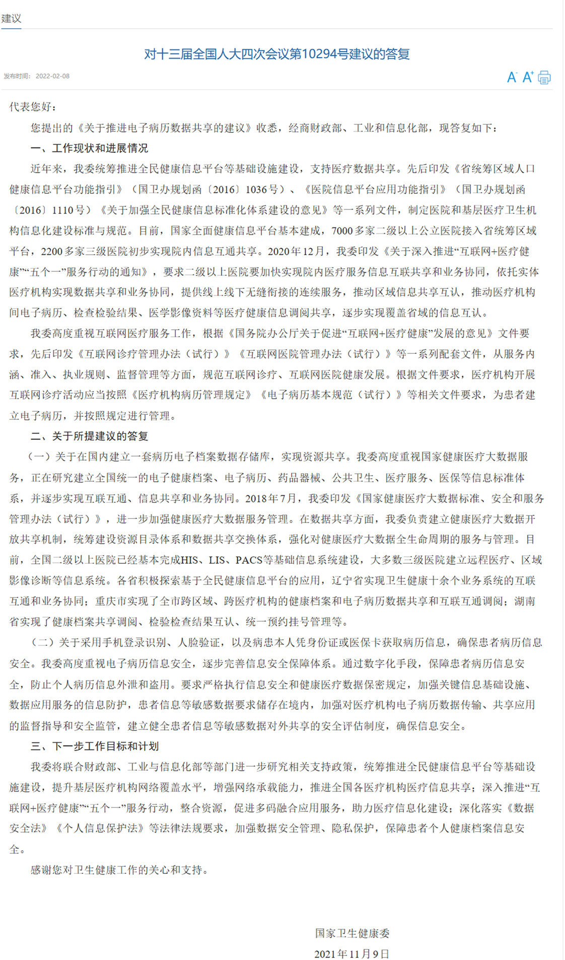 國(guó)家衛(wèi)健委在《答復(fù)》中表示,下一步將聯(lián)合財(cái)政部、工業(yè)與信息化部等部門(mén)進(jìn)一步研究相關(guān)支持政策,統(tǒng)籌推進(jìn)全民健康信息平臺(tái)等基礎(chǔ)設(shè)施建設(shè),提升基層醫(yī)療機(jī)構(gòu)網(wǎng)絡(luò)覆蓋水平,增強(qiáng)網(wǎng)絡(luò)承載能力,推進(jìn)全國(guó)各醫(yī)療機(jī)構(gòu)醫(yī)療信息共享;深入推進(jìn)“互聯(lián)網(wǎng)+醫(yī)療健康”“五個(gè)一”服務(wù)行動(dòng),整合資源,促進(jìn)多碼融合應(yīng)用服務(wù),助力醫(yī)療信息化建設(shè);深化落實(shí)《數(shù)據(jù)安全法》《個(gè)人信息保護(hù)法》等法律法規(guī)要求,加強(qiáng)數(shù)據(jù)安全管理、隱私保護(hù),保障患者個(gè)人健康檔案信息安全。