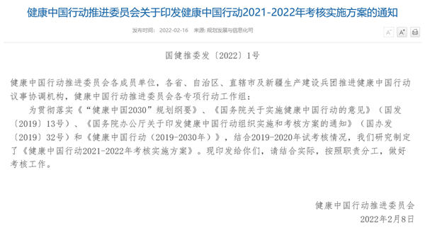 國家衛(wèi)健委發(fā)布健康中國行動2021-2022年考核實(shí)施方案 將從五維度進(jìn)行考核