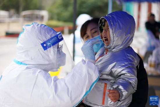 2月16日,在蘇州工業(yè)園區(qū)星灣社區(qū)群星苑小區(qū),醫(yī)務(wù)人員在對小朋友進行核酸采樣。新華社記者 季春鵬 攝