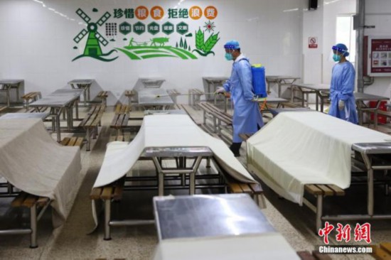 資料圖為工作人員對教室、食堂、衛(wèi)生間等展開全面消毒。 泱波 攝