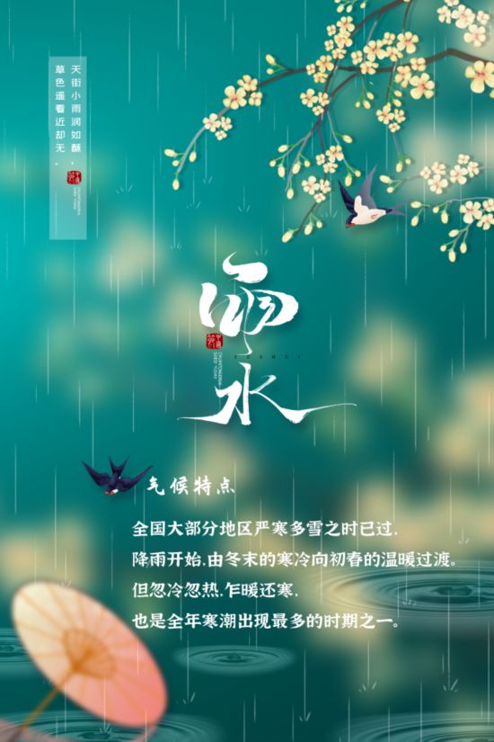 江蘇省農(nóng)業(yè)科學(xué)院研究員陳新、南京信息工程大學(xué)應(yīng)用氣象學(xué)院副教授江曉東介紹,雨水節(jié)氣時,太陽直射點由南半球向赤道靠近。此時全國氣候總體趨勢是由冬末的寒冷向初春的溫暖過渡。全國大部分地區(qū)多雪之時已過,降雨開始,氣溫回升,但降雨仍以毛毛細(xì)雨為主。