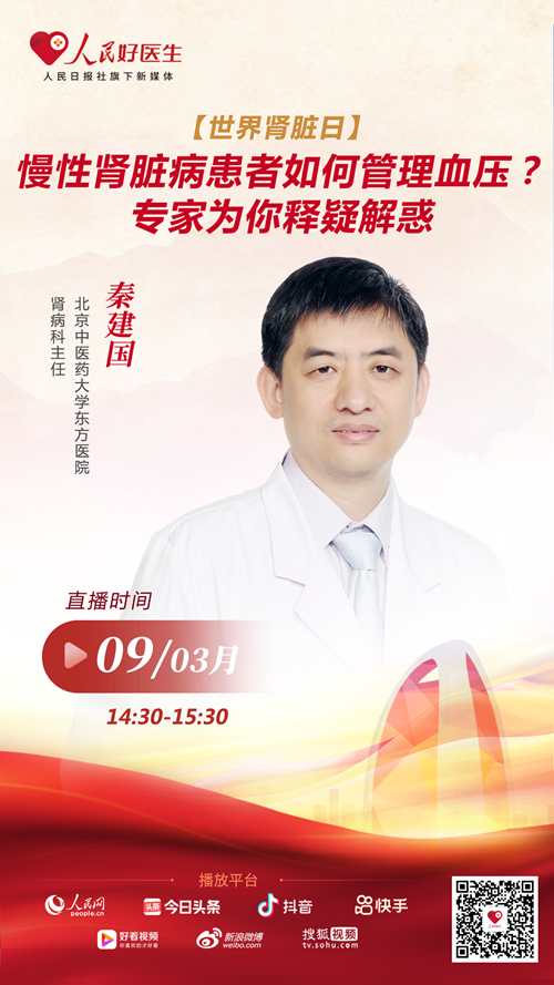 3月9日14:30,北京中醫(yī)藥大學(xué)東方醫(yī)院腎病科主任秦建國將做客人民日報(bào)社旗下新媒體平臺“人民好醫(yī)生”客戶端直播間,向廣大網(wǎng)友分享慢性腎臟疾病相關(guān)知識,歡迎屆時收看。