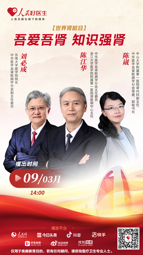 3月9日14:00,浙江大學附屬第一醫(yī)院腎臟病中心主任、中華醫(yī)學會腎臟病學分會主任委員陳江華,東南大學醫(yī)學院院院長、中華醫(yī)學會腎臟病學分會副主任委員劉必成,中山大學附屬第一醫(yī)院腎內科副主任、中華醫(yī)學會腎臟病學分會常委、副秘書長陳崴將做客人民日報社旗下新媒體平臺“人民好醫(yī)生”客戶端直播間,向廣大網友分享慢性腎臟疾病相關知識,歡迎屆時收看。