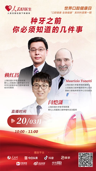 3月20日正值世界口腔健康日,人民日報社旗下新媒體平臺“人民好醫(yī)生”將邀請到上海交通大學(xué)醫(yī)學(xué)院附屬第九人民醫(yī)院口腔種植科主任賴紅昌、上海交通大學(xué)醫(yī)學(xué)院附屬第九人民醫(yī)院口腔種植研究中心主任Maurizio Tonetti、上海交通大學(xué)醫(yī)學(xué)院附屬第九人民醫(yī)院口腔種植科主治醫(yī)師閆愷瀟做客直播間,為大家詳細(xì)解答口腔種植相關(guān)問題,千萬不要錯過。