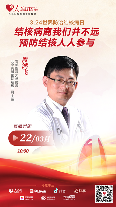 3月22日10:00首都醫(yī)科大學附屬北京胸科醫(yī)院結(jié)核三科主任段鴻飛做客人民好醫(yī)生客戶端,與大家分享預防結(jié)核的相關(guān)內(nèi)容。