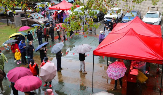 3月21日,在位于上海閔行的一個(gè)居民小區(qū)內(nèi),居民排隊(duì)進(jìn)行核酸檢測(cè)采樣。新華社記者 方喆 攝