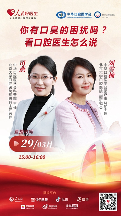 3月29日15:00中華口腔醫(yī)學(xué)會(huì)科普部主任、北京大學(xué)口腔醫(yī)院預(yù)防科主任醫(yī)師司燕,中華口腔醫(yī)學(xué)會(huì)醫(yī)療事業(yè)部主任、北京大學(xué)口腔醫(yī)院副研究員劉雪楠做客人民好醫(yī)生客戶端,為大家解除口臭的困擾。