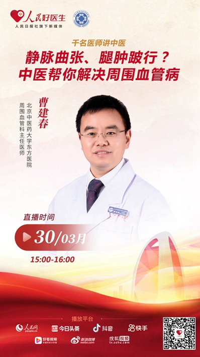 3月30日15:00至16:00,人民日?qǐng)?bào)社旗下新媒體平臺(tái)“人民好醫(yī)生”與國(guó)家中醫(yī)藥管理局辦公室聯(lián)合推出的“千名醫(yī)師講中醫(yī)”系列直播將邀請(qǐng)北京中醫(yī)藥大學(xué)東方醫(yī)院周圍血管科曹建春主任醫(yī)師做客直播間,為大家詳細(xì)講解中醫(yī)如何認(rèn)識(shí)和應(yīng)對(duì)周圍血管疾病。