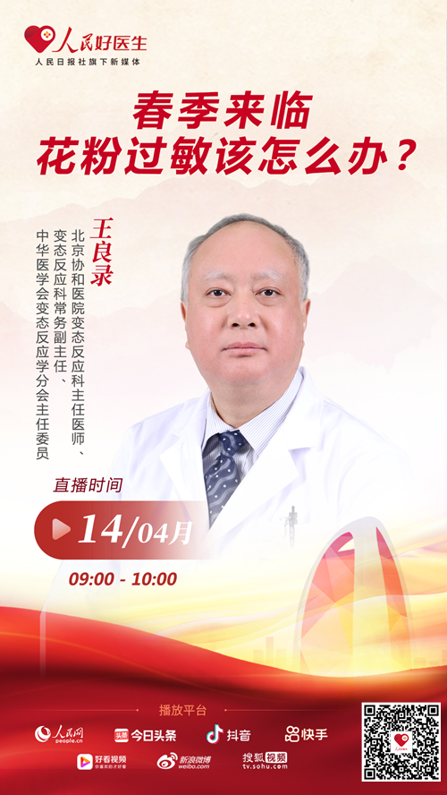 4月14日9:00,北京協(xié)和醫(yī)院變態(tài)反應(yīng)科主任醫(yī)師、變態(tài)反應(yīng)科常務(wù)副主任、中華醫(yī)學(xué)會(huì)變態(tài)反應(yīng)學(xué)分會(huì)主任委員王良錄將做客“人民好醫(yī)生”APP直播間,與大家分享相關(guān)春季花粉過敏防治科普知識(shí)。