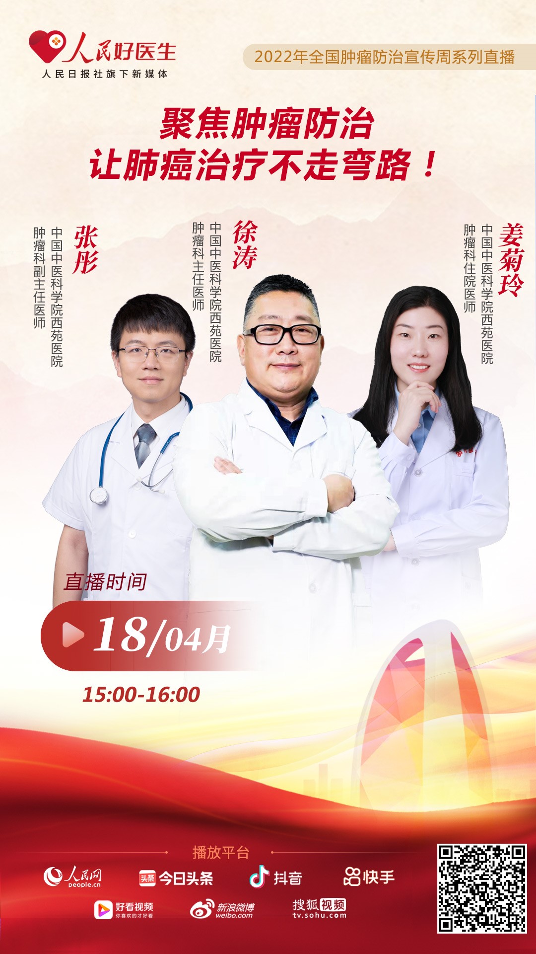 4月18日15:00,中國中醫(yī)科學(xué)院西苑醫(yī)院腫瘤科主任醫(yī)師徐濤、中國中醫(yī)科學(xué)院西苑醫(yī)院腫瘤科副主任張彤、中國中醫(yī)科學(xué)院西苑醫(yī)院腫瘤科住院醫(yī)師姜菊玲將做客“人民好醫(yī)生”客戶端,為公眾普及肺癌防治相關(guān)知識。