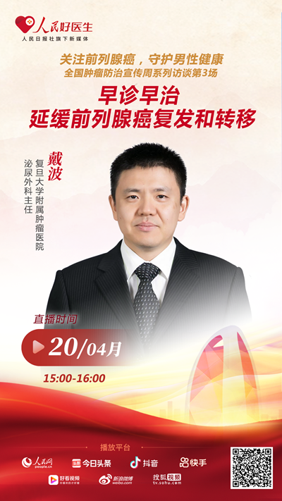 4月20日15:00至16:00,“人民好醫(yī)生”客戶端將邀請到復(fù)旦大學(xué)附屬腫瘤醫(yī)院泌尿外科主任戴波做客演播室,圍繞前列腺癌早診早治這一主題進(jìn)行科普,讓公眾與患者了解疾病的危害。