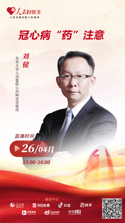 4月26日15:00,北京大學(xué)人民醫(yī)院心內(nèi)科主任醫(yī)師劉健將做客“人民好醫(yī)生”健康科普直播間,與大家就冠心病診治的相關(guān)問題進(jìn)行分享。