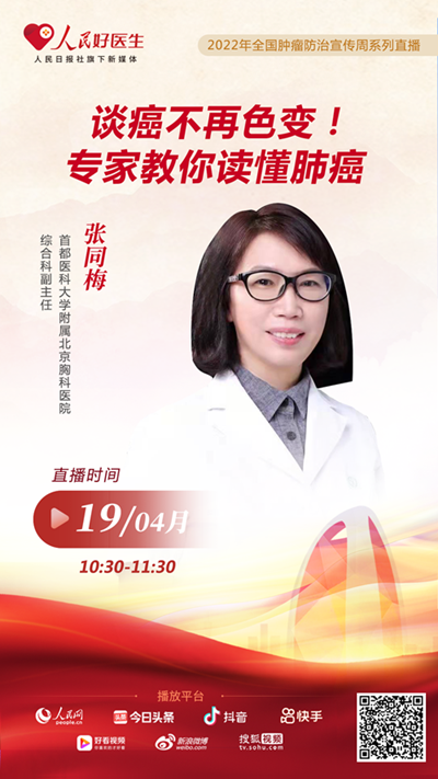 4月19日10:30,首都醫(yī)科大學(xué)附屬北京胸科醫(yī)院綜合科副主任、北京腫瘤防治研究會(huì)癌癥早篩早診早治分委會(huì)主任委員張同梅將做客“人民好醫(yī)生”客戶端直播間,向廣大網(wǎng)友分享肺癌診治相關(guān)知識(shí),歡迎屆時(shí)收看。