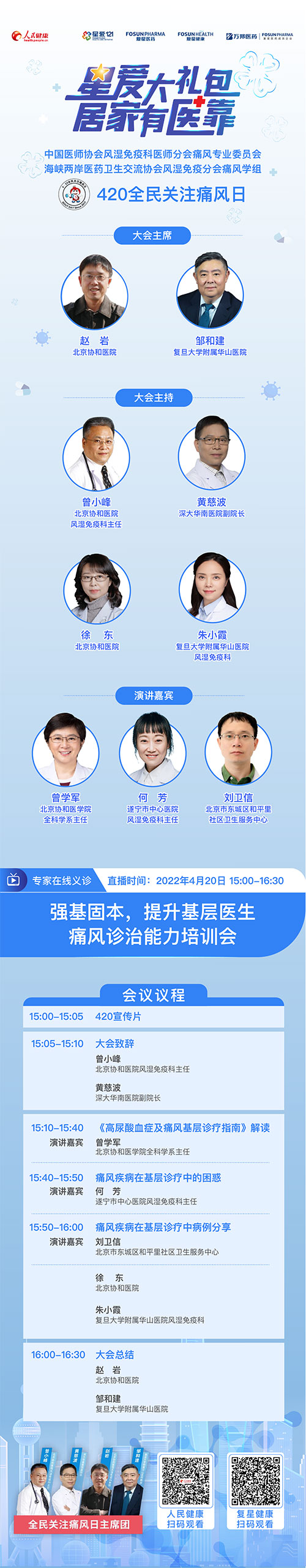 4月20日全民關(guān)注痛風(fēng)日當(dāng)天,“星愛(ài)大禮包、居家有醫(yī)靠”項(xiàng)目將推出直播活動(dòng)——強(qiáng)基固本,提升基層醫(yī)生痛風(fēng)診治能力培訓(xùn)會(huì)。此次直播活動(dòng)由中國(guó)醫(yī)師協(xié)會(huì)風(fēng)濕免疫科醫(yī)師分會(huì)痛風(fēng)專委會(huì)及海峽兩岸醫(yī)藥衛(wèi)生交流協(xié)會(huì)風(fēng)濕免疫分會(huì)痛風(fēng)學(xué)組聯(lián)合發(fā)起,邀請(qǐng)北京協(xié)和醫(yī)院風(fēng)濕免疫科主任曾小峰、深大華南醫(yī)院副院長(zhǎng)黃慈波、北京協(xié)和醫(yī)院風(fēng)濕免疫科趙巖和復(fù)旦大學(xué)附屬華山醫(yī)院鄒和建等風(fēng)濕免疫領(lǐng)域的權(quán)威專家,通過(guò)線上培訓(xùn)的形式提升基層醫(yī)生的診療水平。