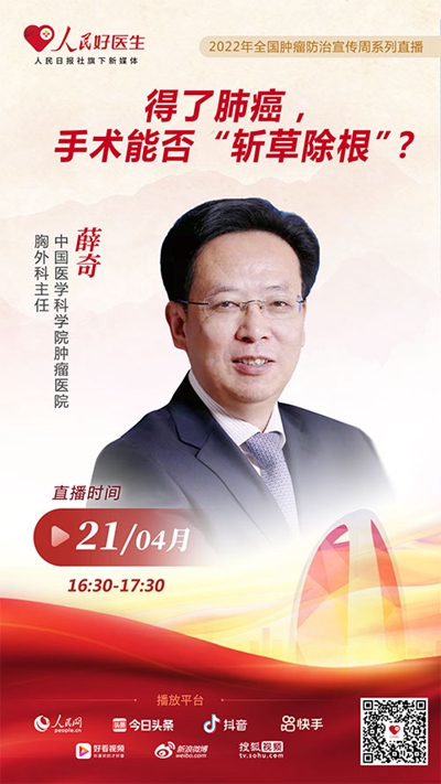 說起肺癌,大家并不陌生。不僅擁有較高的發(fā)病率與死亡率,而且患者的發(fā)病年齡也逐漸年輕化……因此,公眾對肺癌的正確認(rèn)知就變得尤為重要。4月21日16:30至17:30,“人民好醫(yī)生”客戶端將邀請中國醫(yī)學(xué)科學(xué)院腫瘤醫(yī)院胸外科主任薛奇做客演播室,從外科醫(yī)生的角度與我們一起來說說肺癌防治那些事兒。