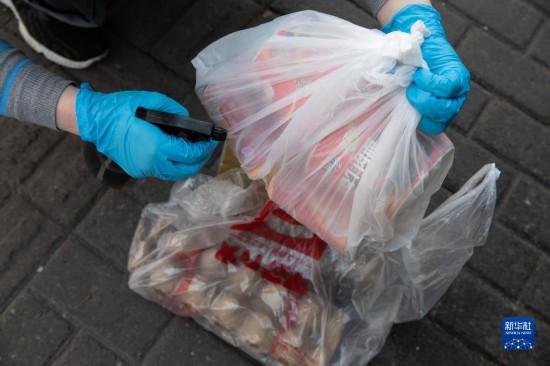 4月17日,在上海黃浦區(qū)豫園街道廣福居民區(qū),廣福居委會工作人員對分裝好的物資進(jìn)行消毒處理。新華社記者 金立旺 攝